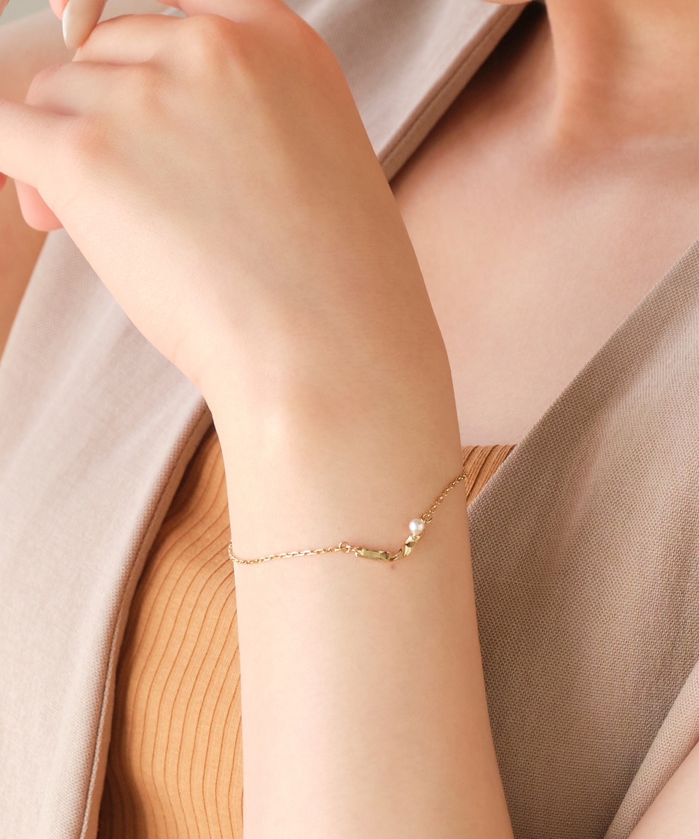 「Phoebe」の「ベンディングパールブレスレット」は、細めのゴールドチェーンが上品な印象。さりげなくセッテイングされた貝パール、ひねりの効いたラインなど、シンプルながらも個性が光るアイテムです。