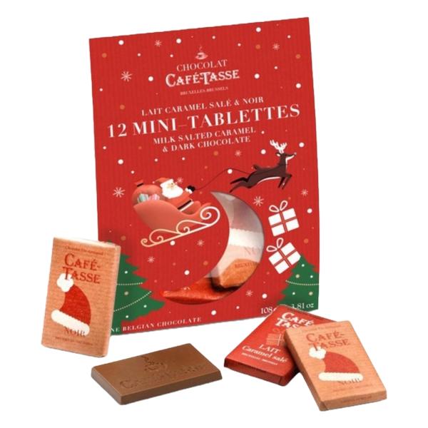 サンタクロースの絵が可愛いチョコレート。塩キャラメルミルクチョコとビターチョコの2種類の味が入っています。個包装の紙包みにもクリスマスらしいイラストが描かれていて、職場でのばらまき用にぴったり!デスクの上にちょこんと置かれていると嬉しいプレゼントです。